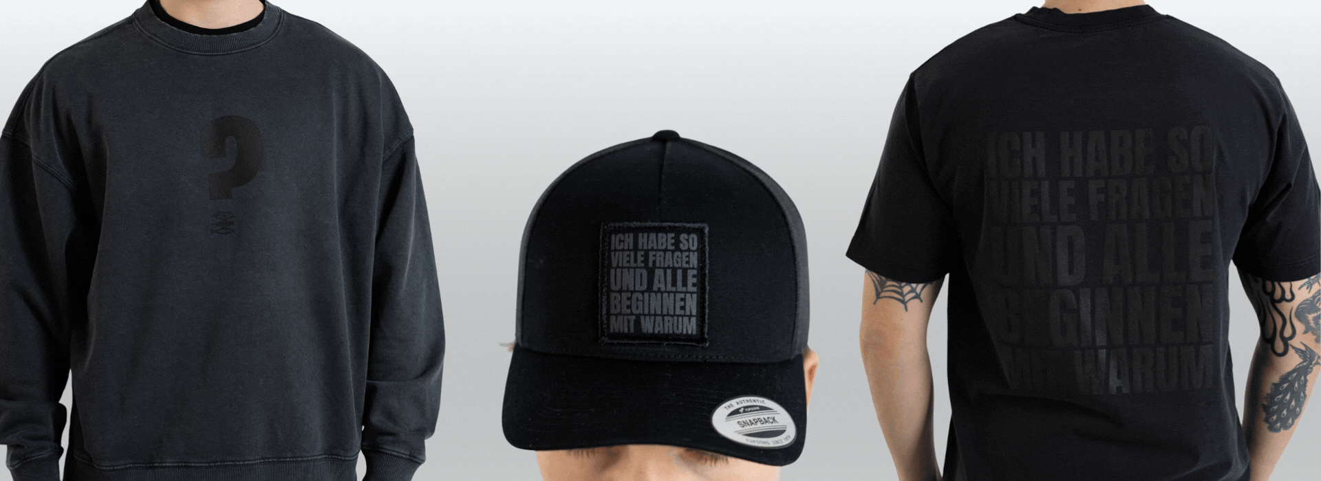 Für alle, die nicht sofort „okay" sagen. Die Warum-Kollektion vereint Kleidungsstücke mit Statement-Charakter – für Menschen, die Fragen stellen und zum Nachdenken anregen. Jedes Stück trägt die Botschaft des kritischen Hinterfragens in sich, zurückhaltend im Look, besonders in der Wirkung.