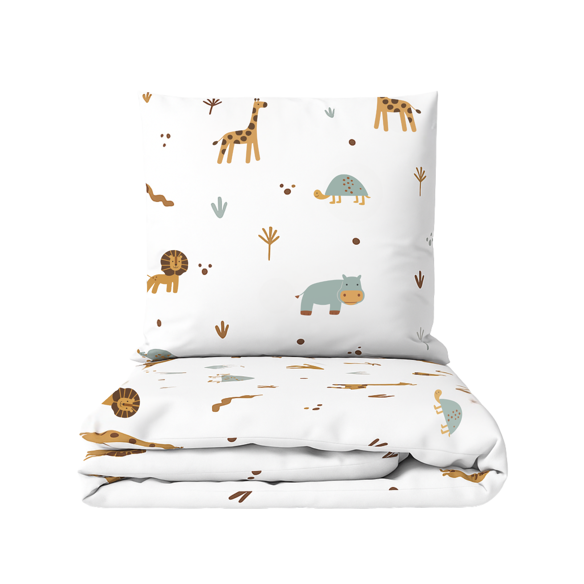 Hochwertige Bettwäsche mit liebevoll illustrierten Tieren wie Löwe, Giraffe und Schildkröte – perfekt für kleine Abenteurer.